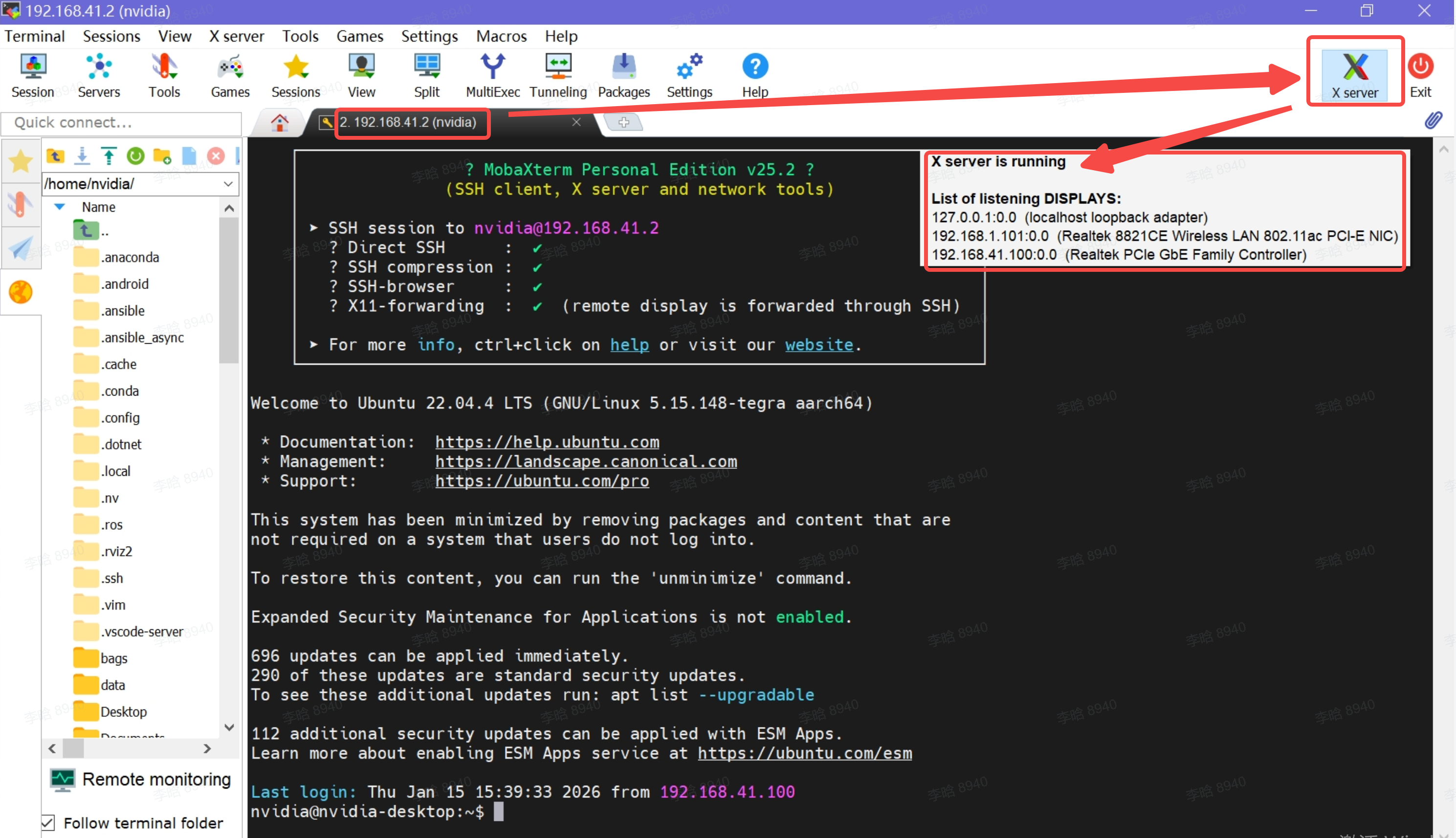 使用 mobaXterm(使用免费版本即可) 连接 192.168.41.2 ,并点击mobaXterm 右上角的 X server,确保 X server 是运行状态(确保标注的区域内显示 X server is running):
