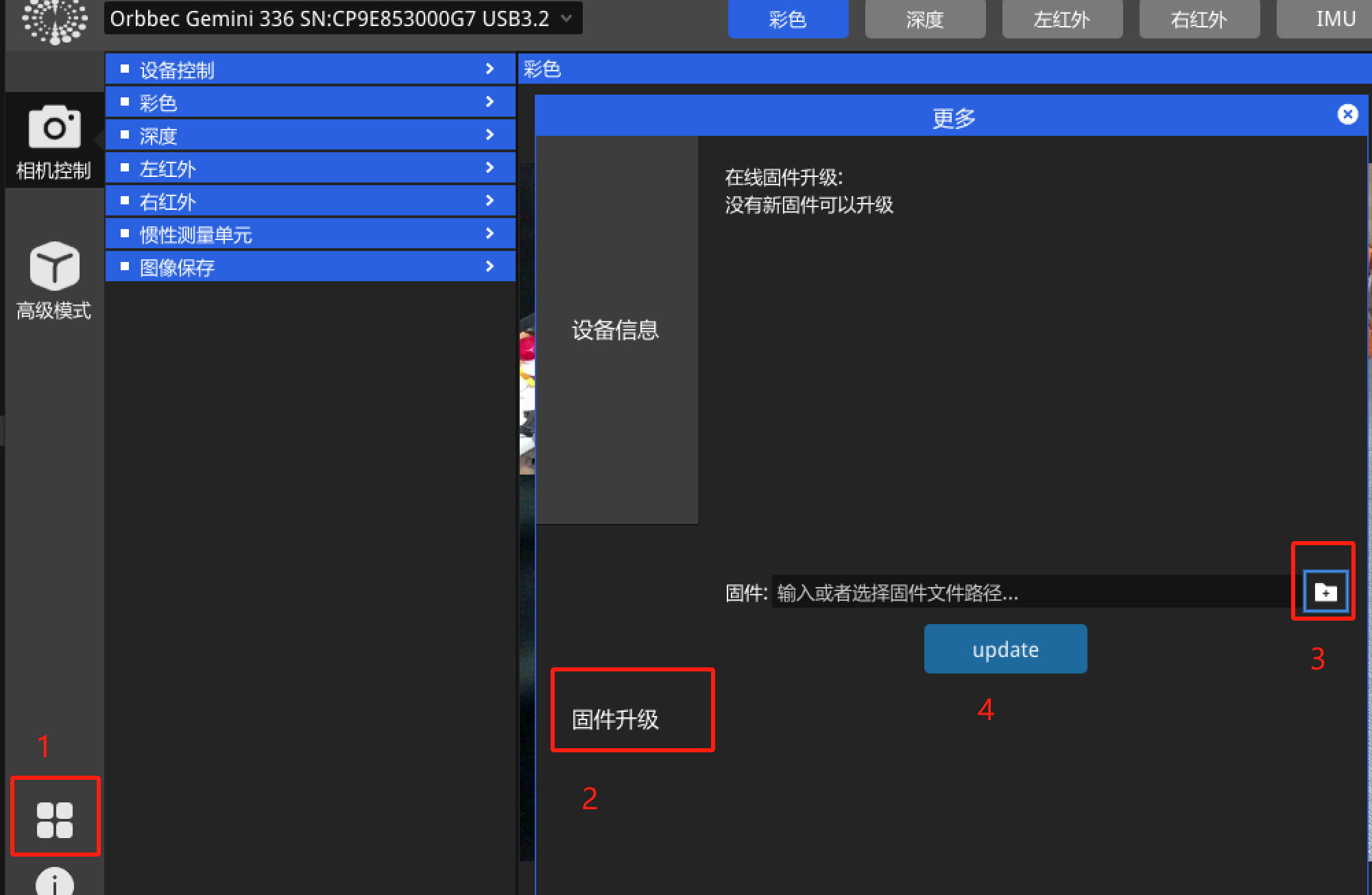 OrbbecViewer,然后按如下顺序操作(注意先只操作到数字3处,然后需要选择固件文件):