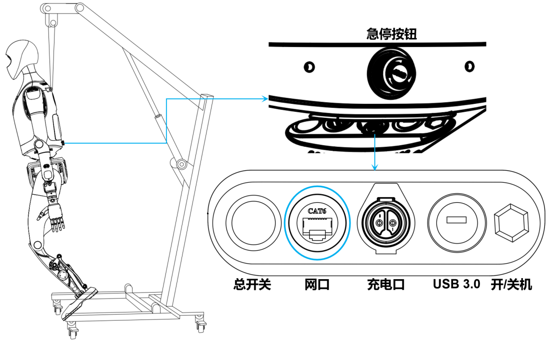 - 将安全绳的安全钩系上机器人后颈下方的固定吊环,并将安全绳连接到保护支架上;