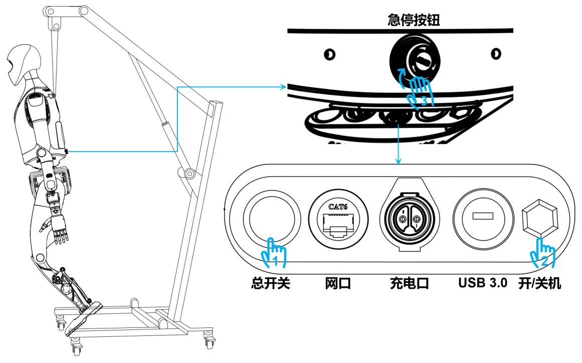 | 3. 确认顺时针旋转急停按钮直至弹出 | 正在唤醒:整机状态灯开始由熄灭 → 白色 → 炫彩 → 蓝绿呼吸; 唤醒成功:机器人会发出长音提示。状态灯进入蓝绿呼吸状态; |