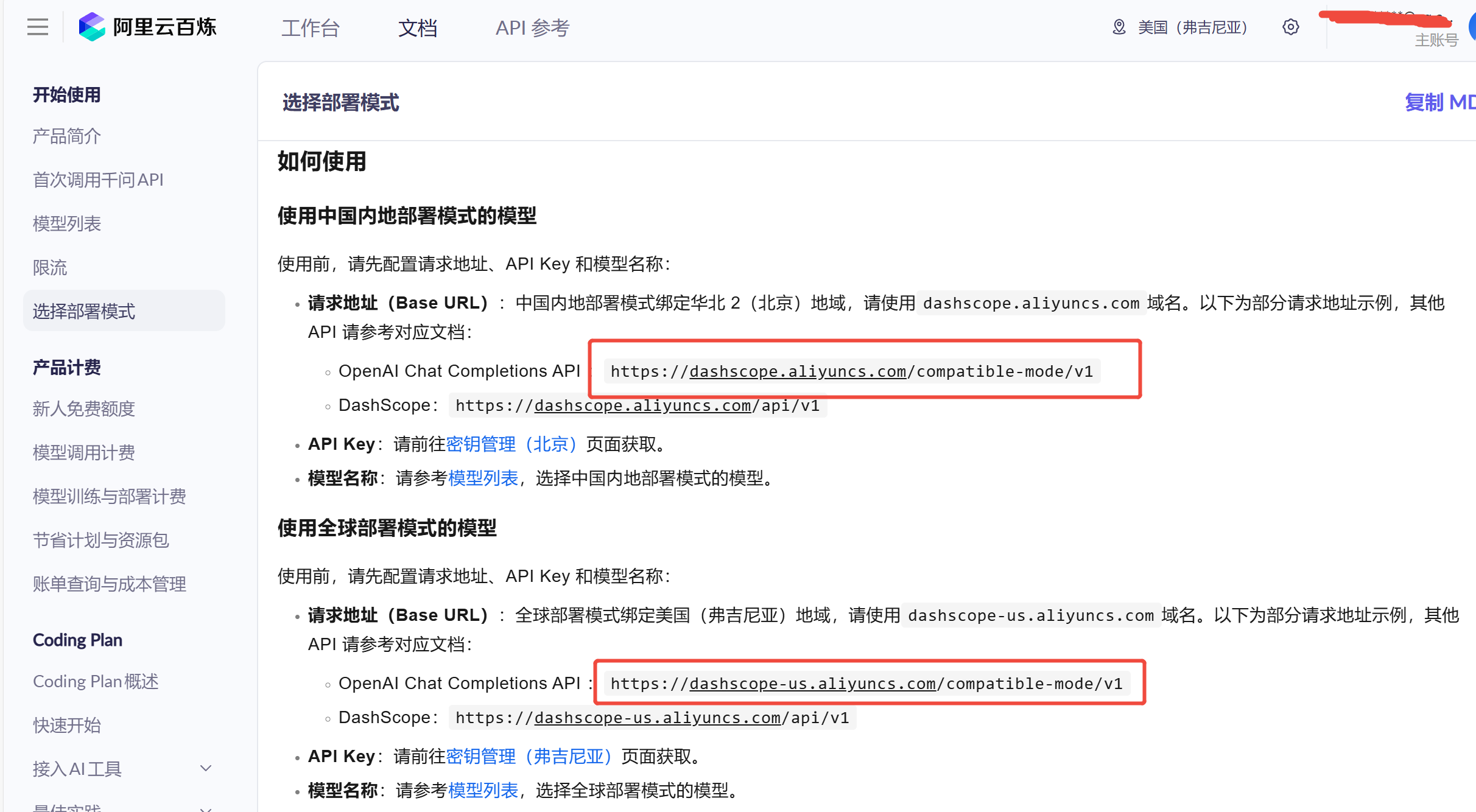 LLM_ENDPOINTmay also be called "Base URL" (e.g., on Alibaba Cloud Bailian Platform). This is the endpoint for the LLM service you want to use.Taking Alibaba Cloud Bailian Platform as an example, you can refer to the Bailian Platform Official Documentation for node selection and key retrieval. As shown in the image below, you can find available nodes and the link to key management.