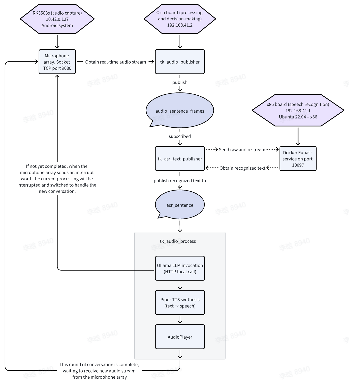 | Audio Playback | Orin Board | AudioPlayer (PyAudio) | Queue-based playback, played directly on Orin1. |