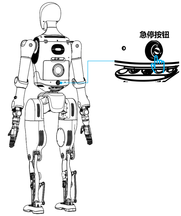 In critical situations, press the emergency stop button on the back of the robot immediately. The robot will lose all posture control and collapse. Then long‑press the power On/Off button for 6 seconds, and finally press the main power switch to cut off all power.