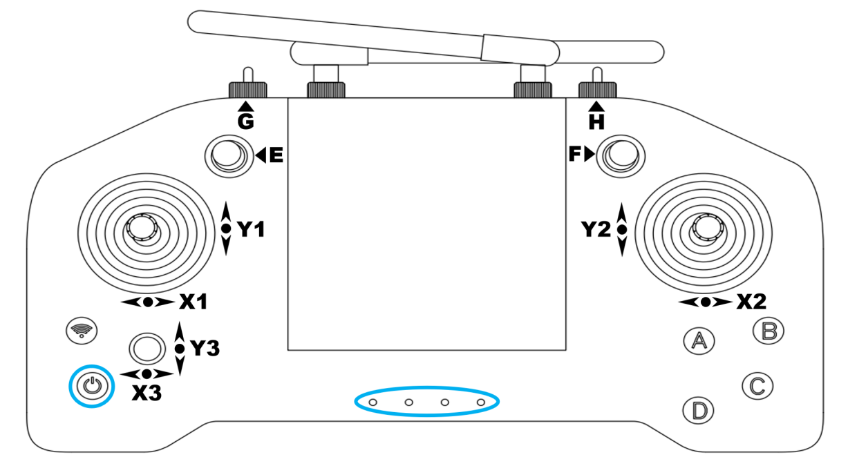 The indicator lights at the bottom center of the controller will light up from left to right, indicating the controller’s battery level. When 1/2/3/4 lights are on, the corresponding levels are 25% / 50% / 75% / 100%.